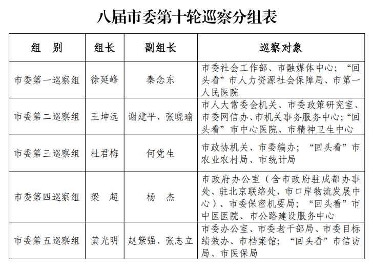 根据市委统一部署,八届市委第十轮巡察派出5个巡察组对市委办公室、市人大常委会机关、市政府办公室、市政协机关、市委社会工作部、市委政策研究室、市委网信办、市委编办、市委老干部局、市委保密机要局、市委目标绩效办、市档案馆、市融媒体中心、市机关事务服务中心等14个市级部门(单位)开展常规巡察,对市人力资源社会保障局、市农业农村局、市统计局、市信访局、市医保局、市中心医院、市第一人民医院、市中医医院、市精神卫生中心、市公路建设服务中心等10个市级部门(单位)开展巡察整改落实情况“回头看”。