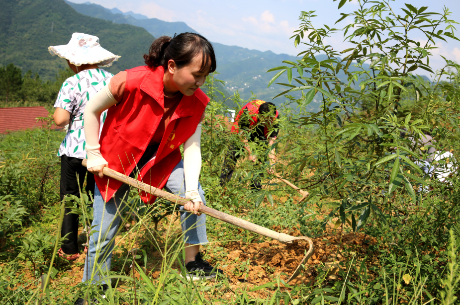 为解决产业发展户用工少的燃眉之急,切实为帮扶村人民群众办实事、解难题。区纪委监委机关党支部党员来到朝天镇松广村,与村民一起在藤椒基地锄草翻地。