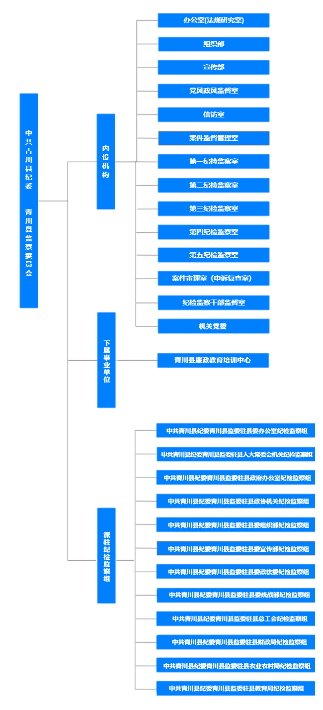 中共青川县纪委青川县监委组织机构包括:内设职能部门、派驻纪检检查组、派出纪检监察组。