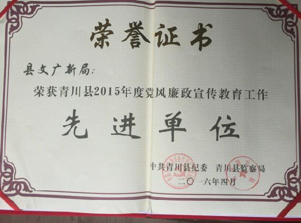 县文广新局被县纪委评为2015年度宣教工作先进单位